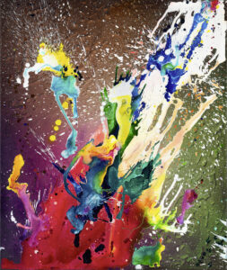 Die charakteristischen Farbexplosionen, Tropfspuren, Sprühnebel und Schichtüberlagerungen sind nicht bloß dekorativ, sondern Ausdruck eines bewusst körperlichen Malprozesses. Awe versteht Malerei als performativen Akt: Farbe wird geschleudert, gegossen, gesprüht, gewischt — jede Bewegung hinterlässt eine sichtbare Spur. Dadurch entsteht ein hochsensibler Dialog zwischen Kontrolle und Zufall, zwischen Intuition und Planung.
